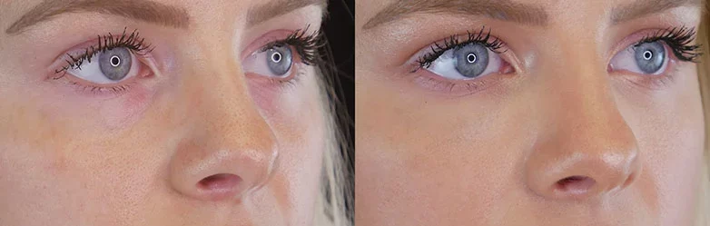 For patients with mild puffiness, Juvederm for eye bags helps blend the lid–cheek junction. It is less effective for severe bags, which often require surgery.